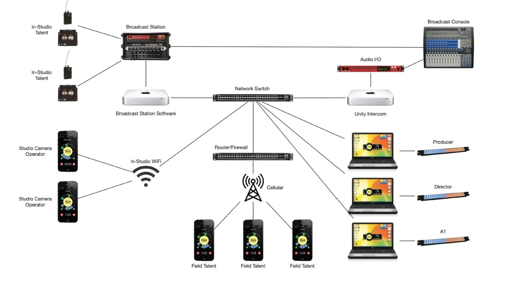The complete Unity Intercom Broadcast Station brings Unity Intercom technology into environments where real-time audio is required and is a huge cost savings compared to traditional broadcast production. In short…This means an entire TV station can now run on Unity Intercom.