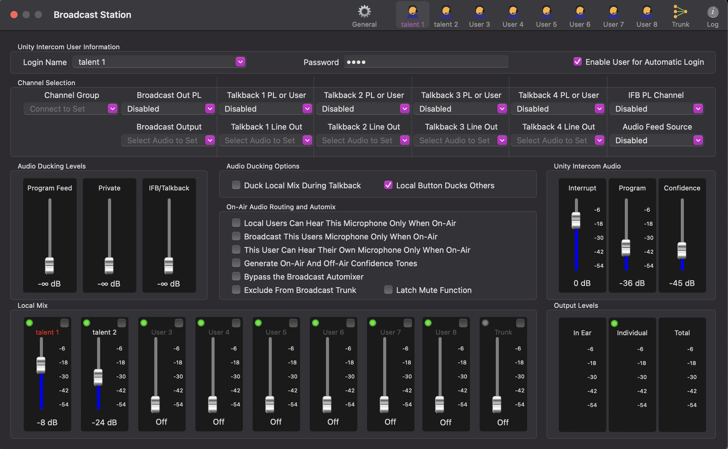 Unity Intercom Broadcast Station implements all local/remote talent-to-talent mixing in software, which eliminates the need for an on-site audio console in many broadcast situations. Local talent audio can optionally be interrupted (IFB) by authorized Unity Intercom users, either fully or proportionately. Talkback switches provide back-channel communications from the talent back to the director/producer locations. Since the audio switching is done in software, the switching is completely silent.